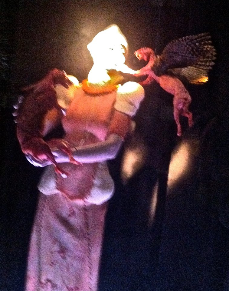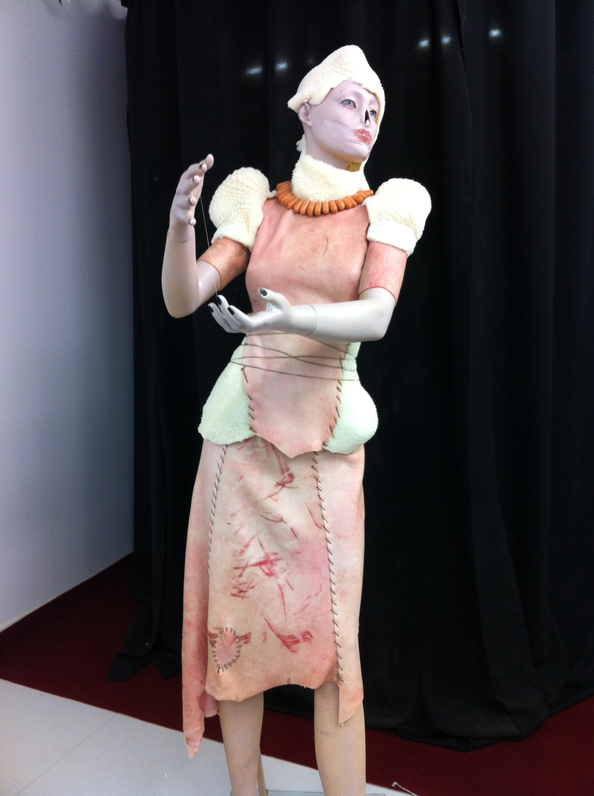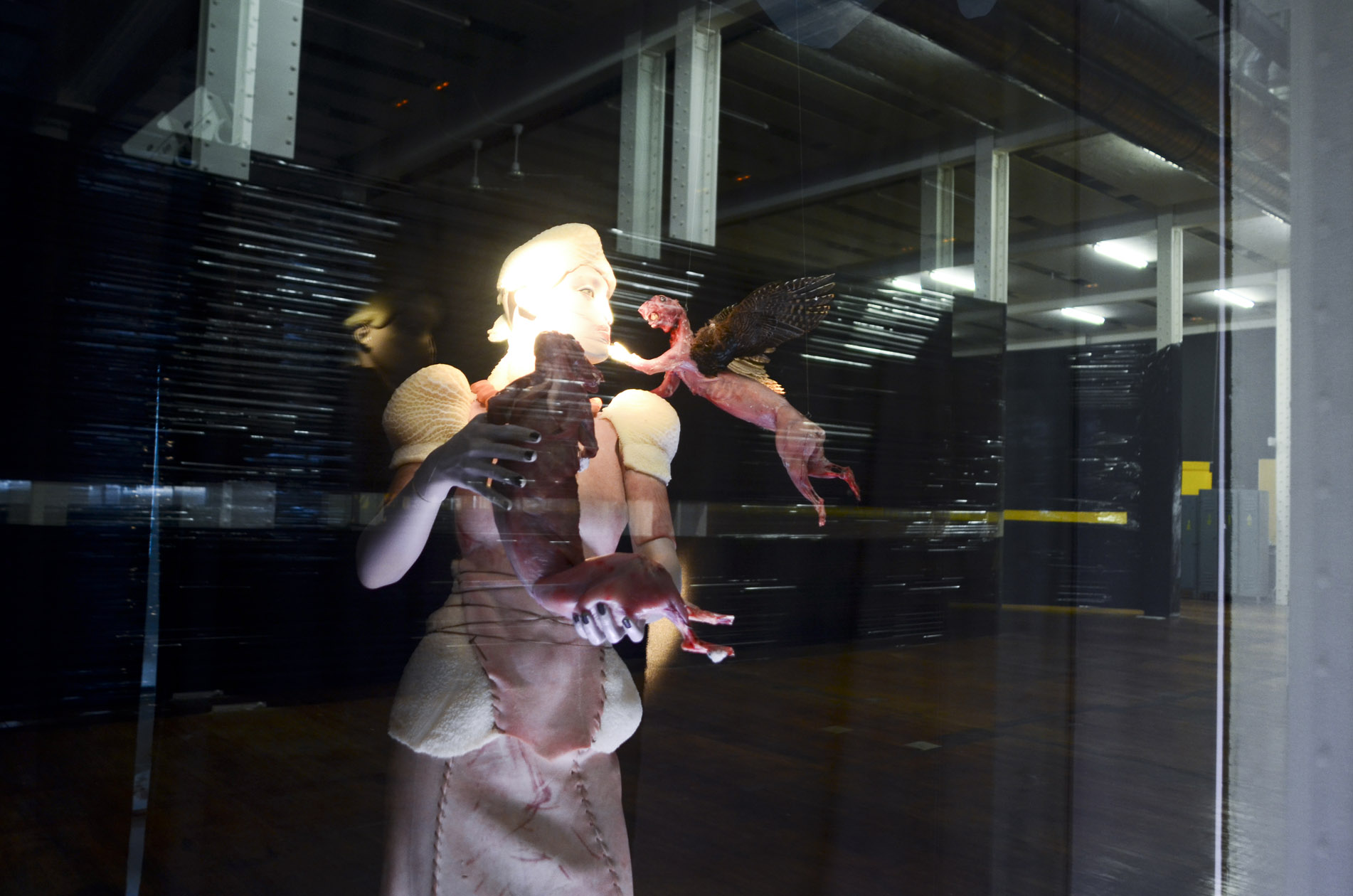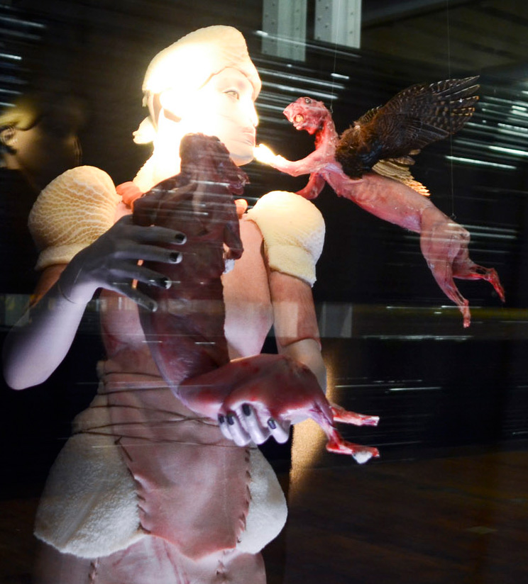 Mentre muntava va haver-hi moments difícils treballant amb materials crus, sagnants i pudents...freixura pura i dura rematada amb salsitxetes de fràncfurt enfilades per fer-li el collaret: estómacs de xai i de vaca, ben blanquejats, pell crua de porc, plegadeta com la venen, el conills gegants morts i escorxats, ales dissecades de Colom argentí... Vaig haver d' instal·lar un aire condicionat darrere la cortina tan aviat com vaig encendre els llums...