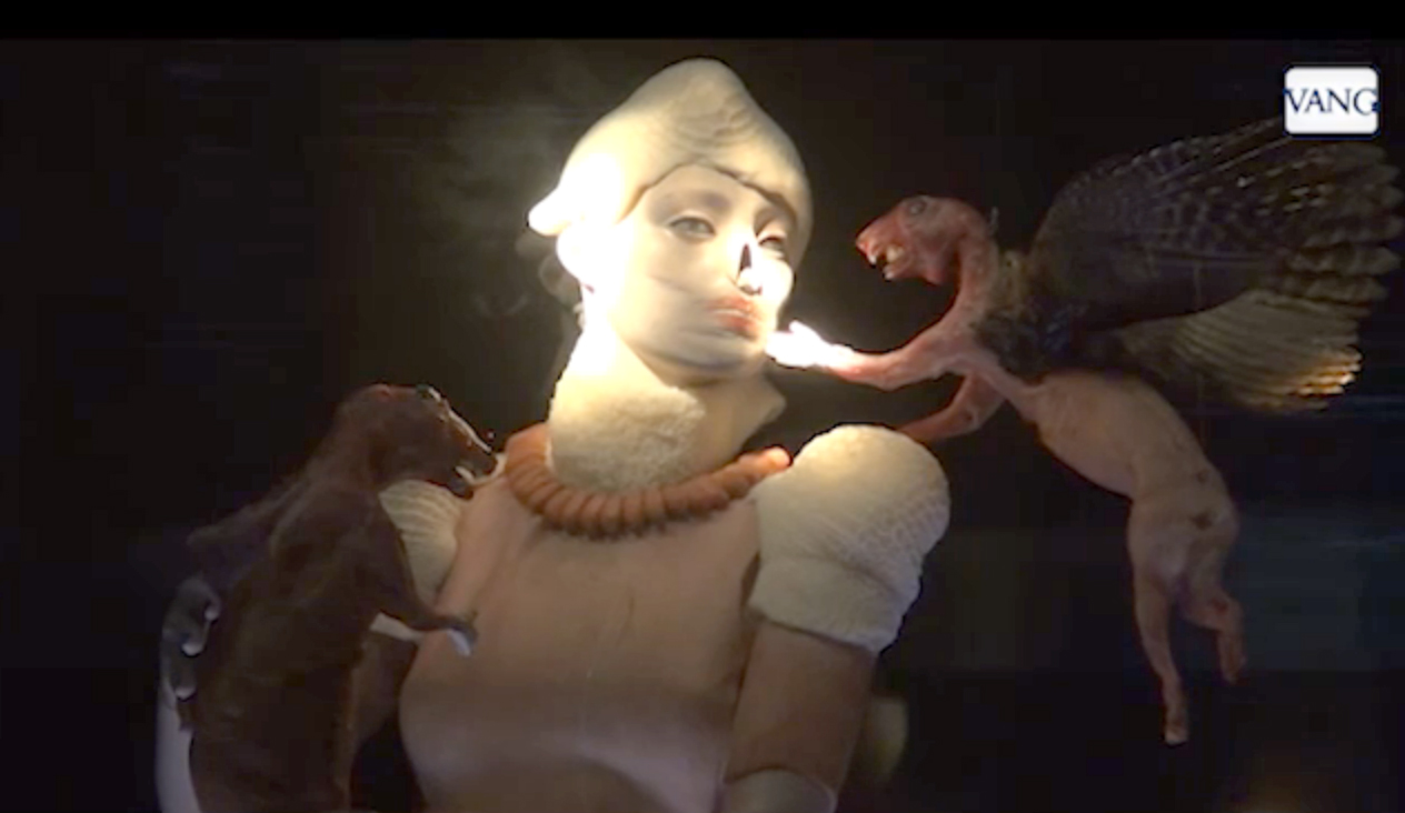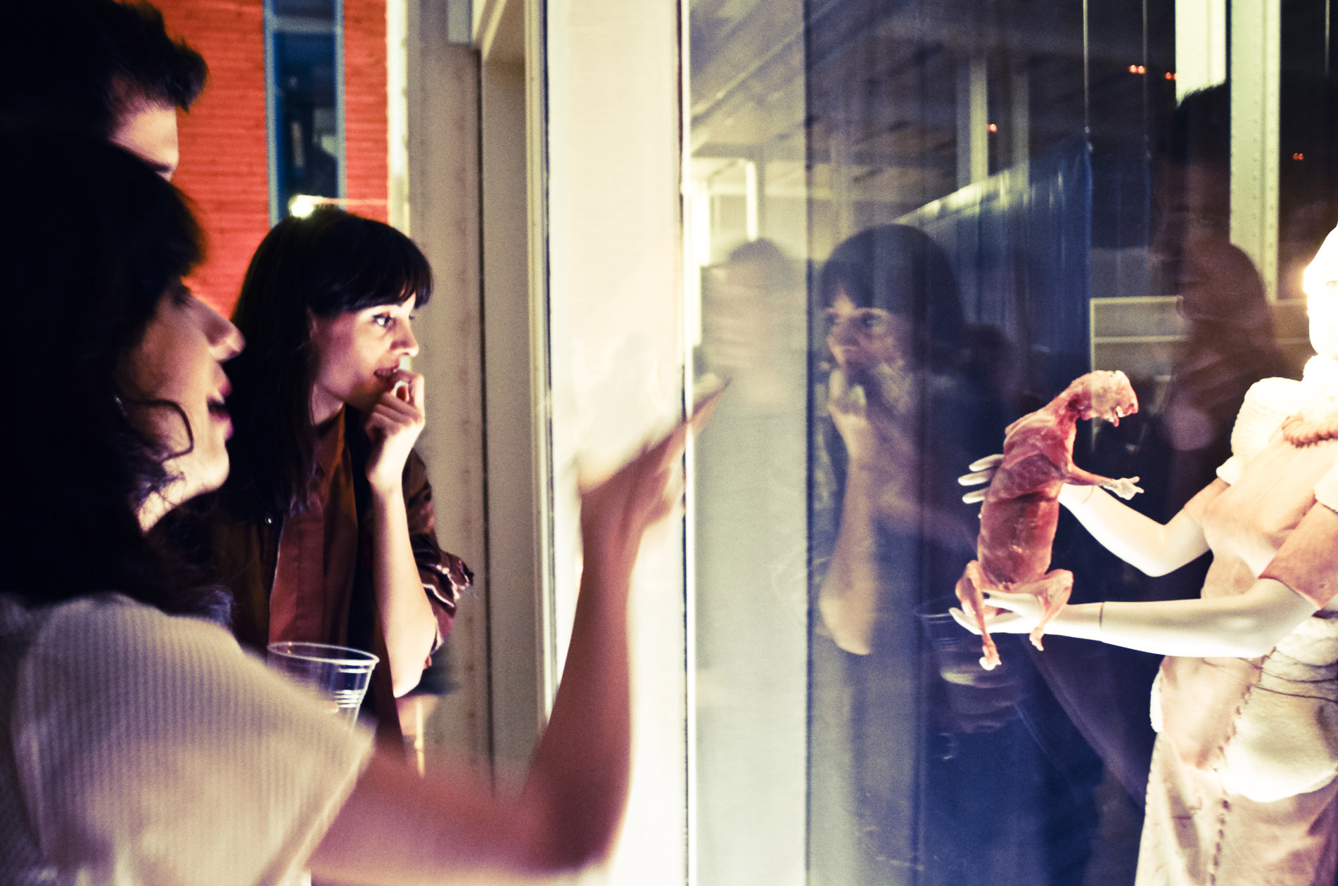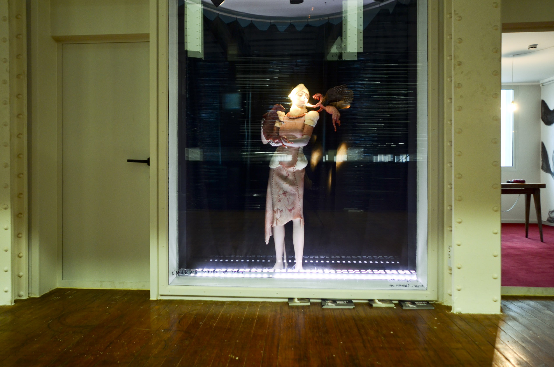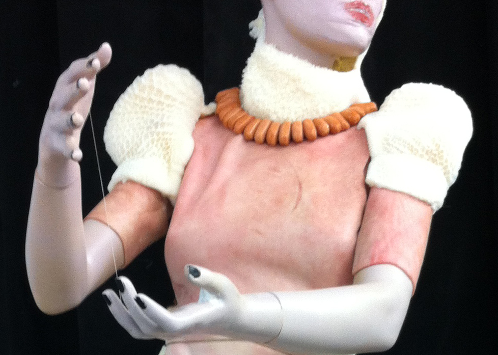 Mentre muntava va haver-hi moments difícils treballant amb materials crus, sagnants i pudents...freixura pura i dura rematada amb salsitxetes de fràncfurt enfilades per fer-li el collaret: estómacs de xai i de vaca, ben blanquejats, pell crua de porc, plegadeta com la venen, el conills gegants morts i escorxats, ales dissecades de Colom argentí... Vaig haver d' instal·lar un aire condicionat darrere la cortina tan aviat com vaig encendre els llums...