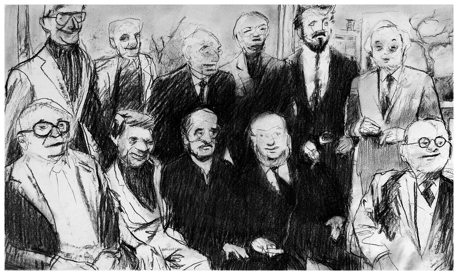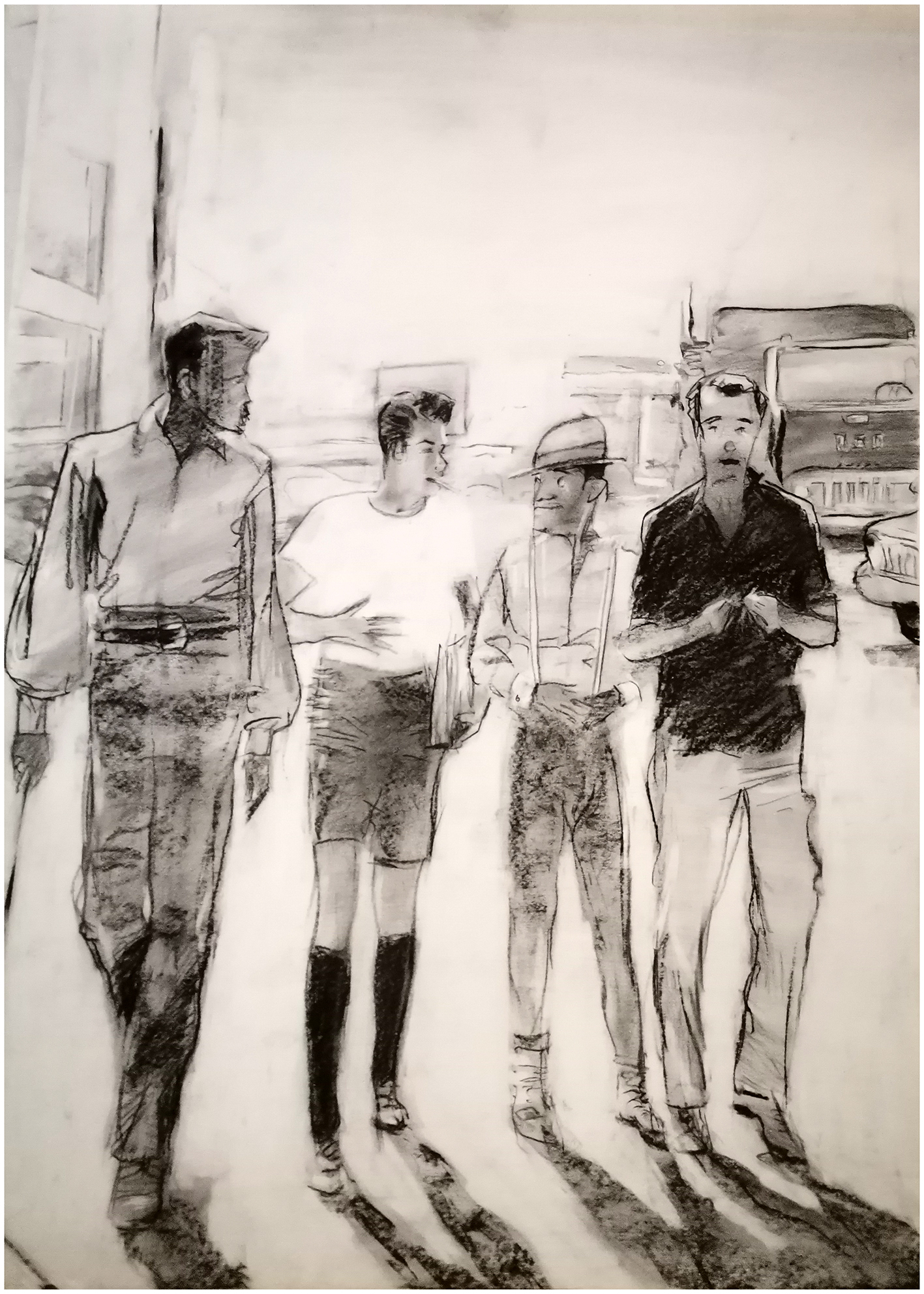 Then, we can see a more recent drawing, portraying four icons from the golden years walking studio backstages...